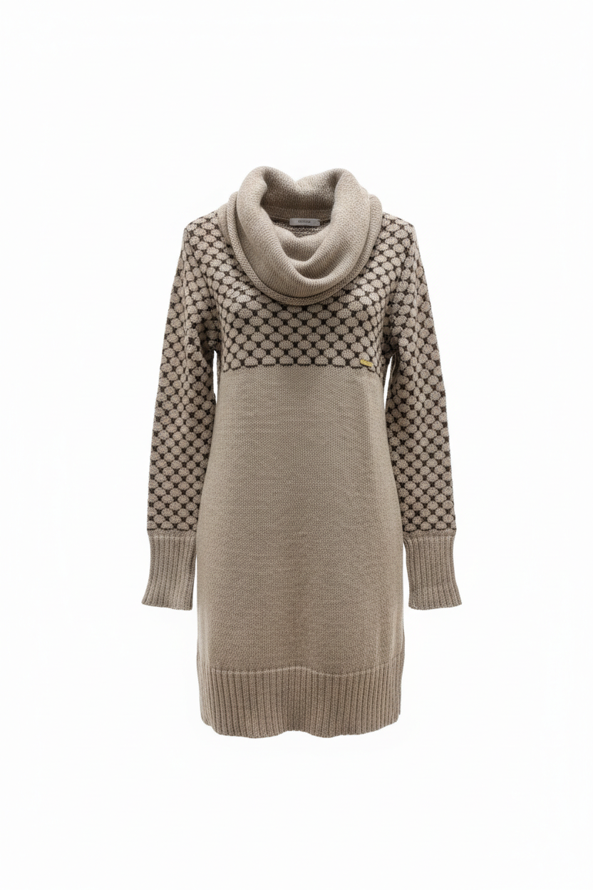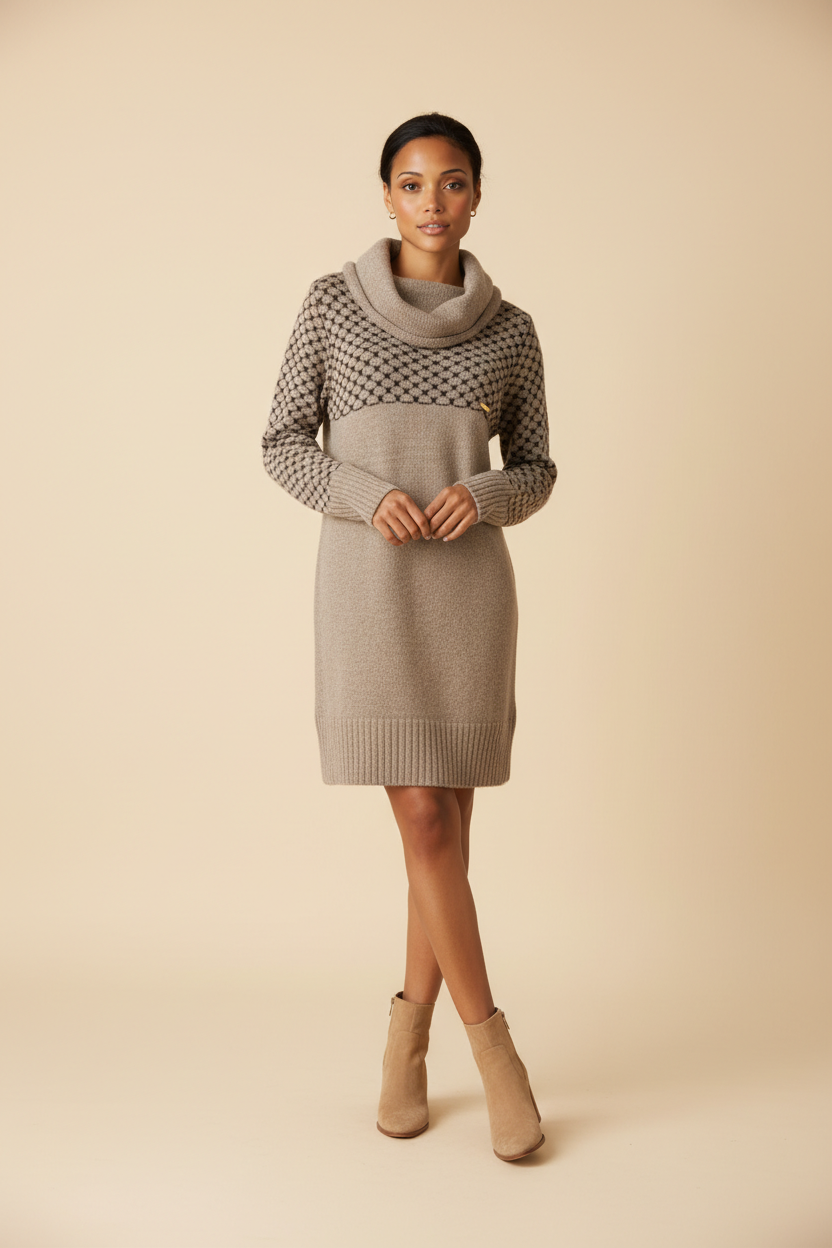 Vestido de malha bege com padrão em relevo cinzento e botins de camurça bege