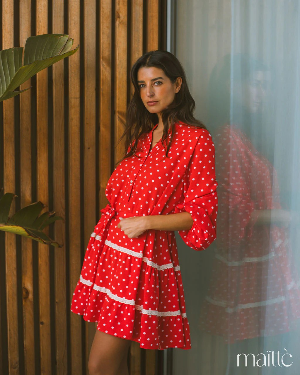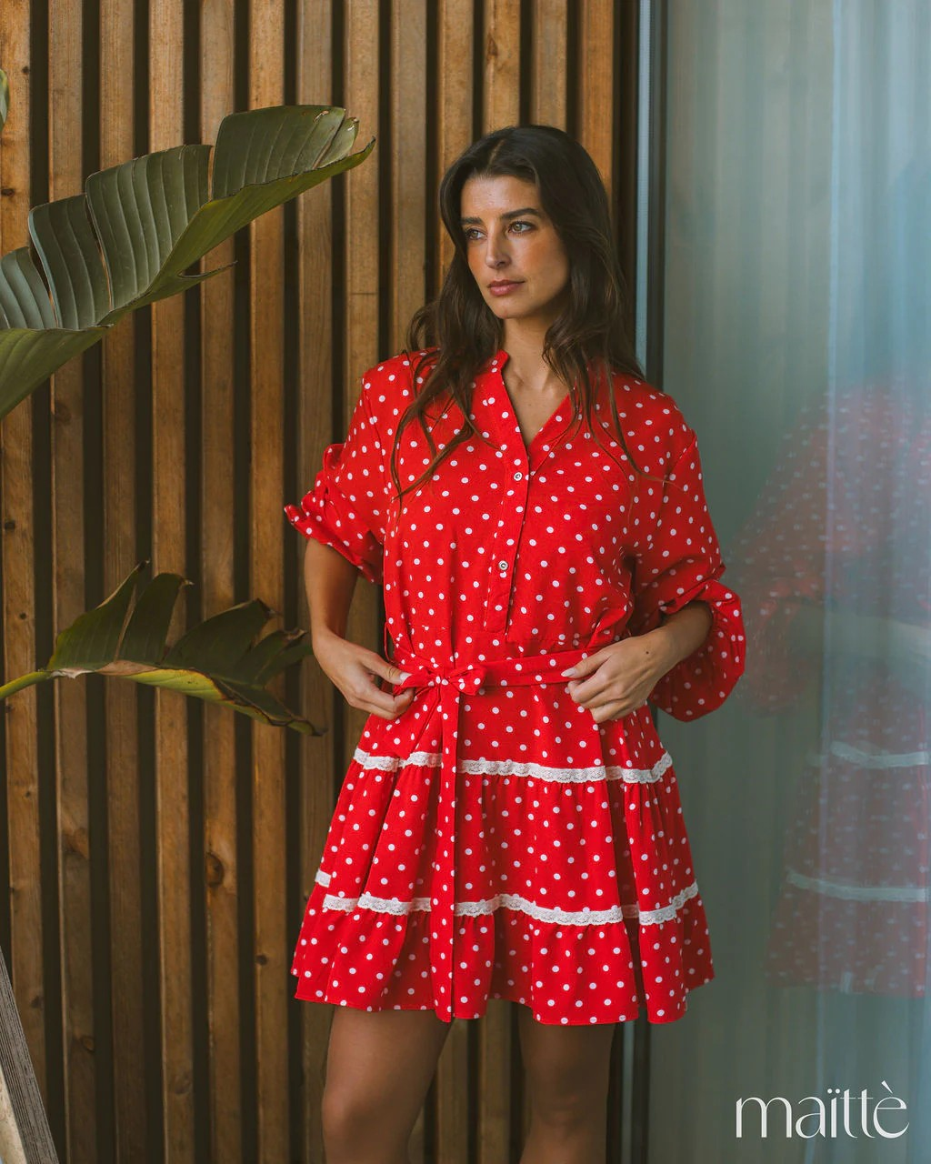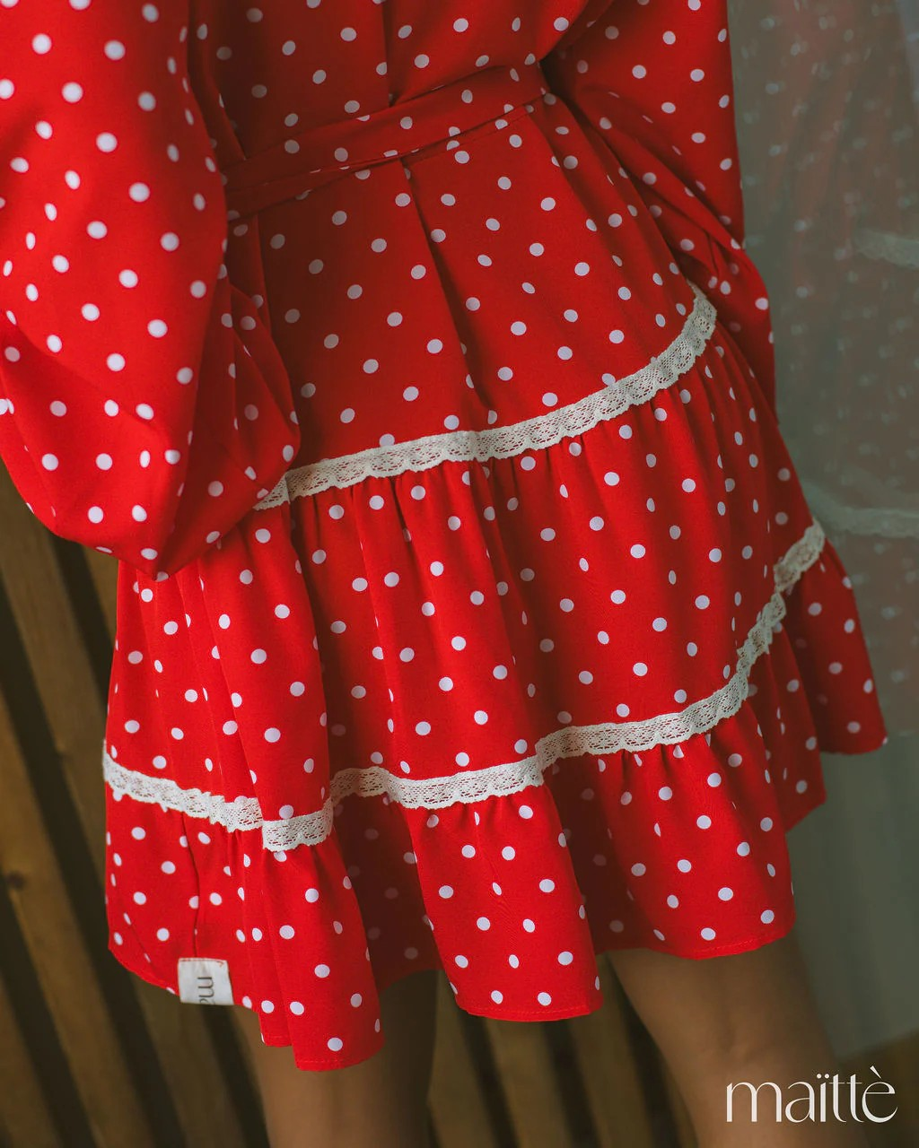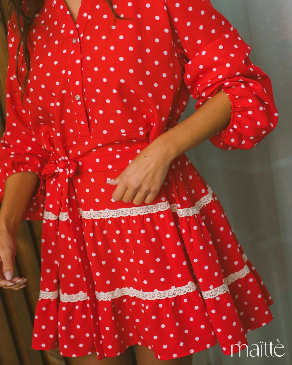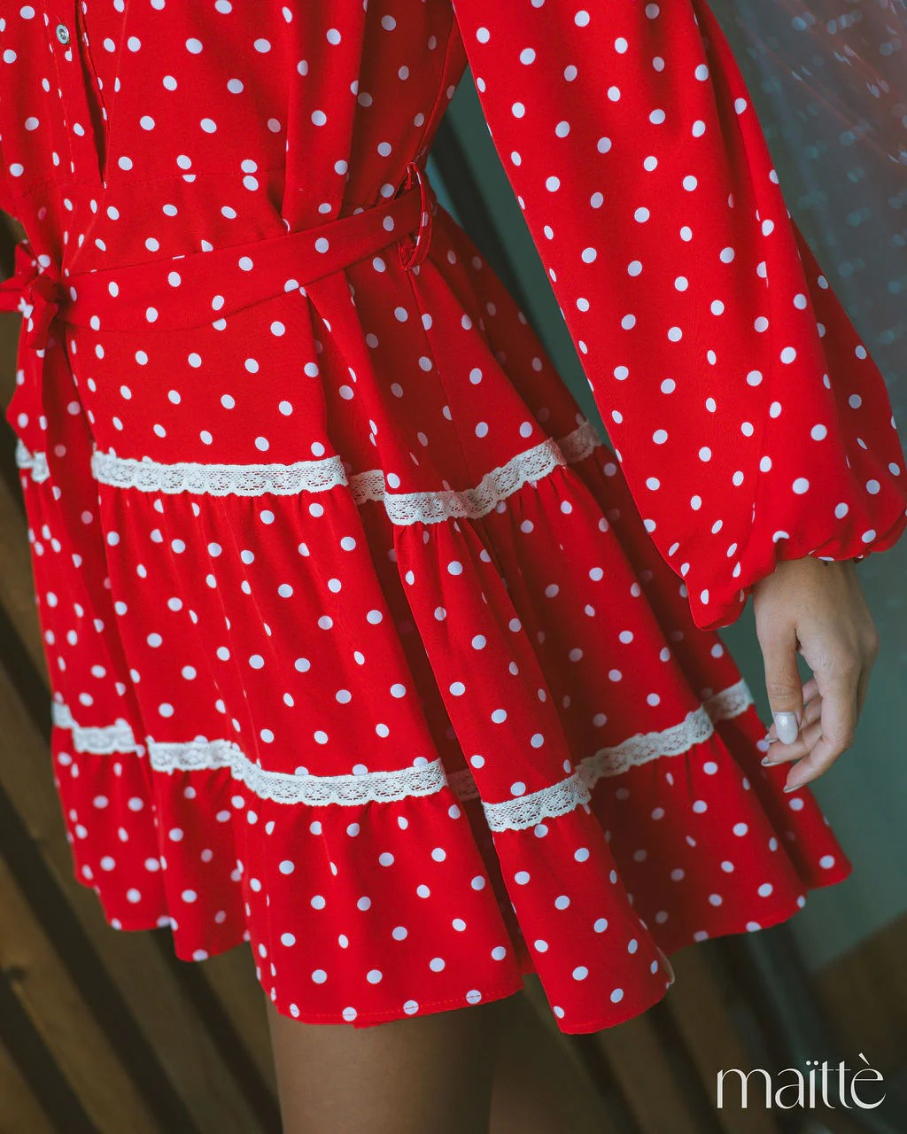 Vestido vermelhos às bolinhas brancas, com cinto incluído.