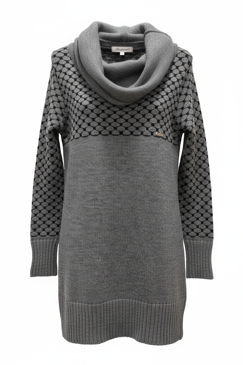 Vestido de malha cinzento com padrão geométrico e gola cachalote