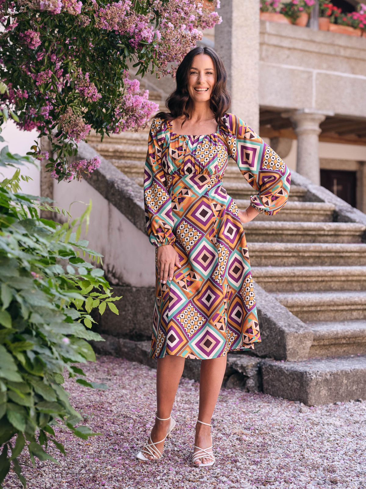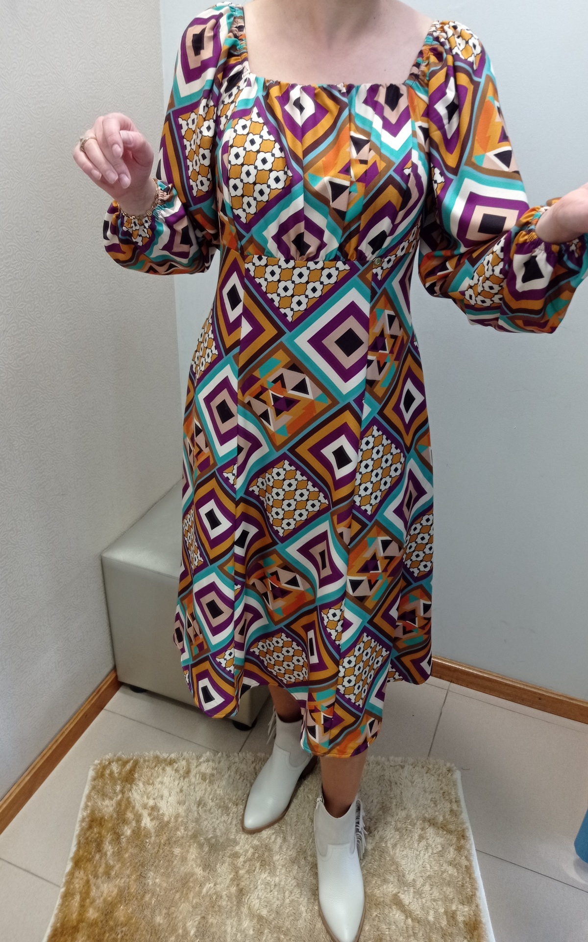 Decote quadrado frente e costas. Corte abaixo do peito franzido na frente.