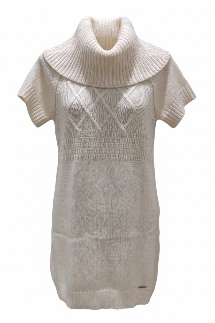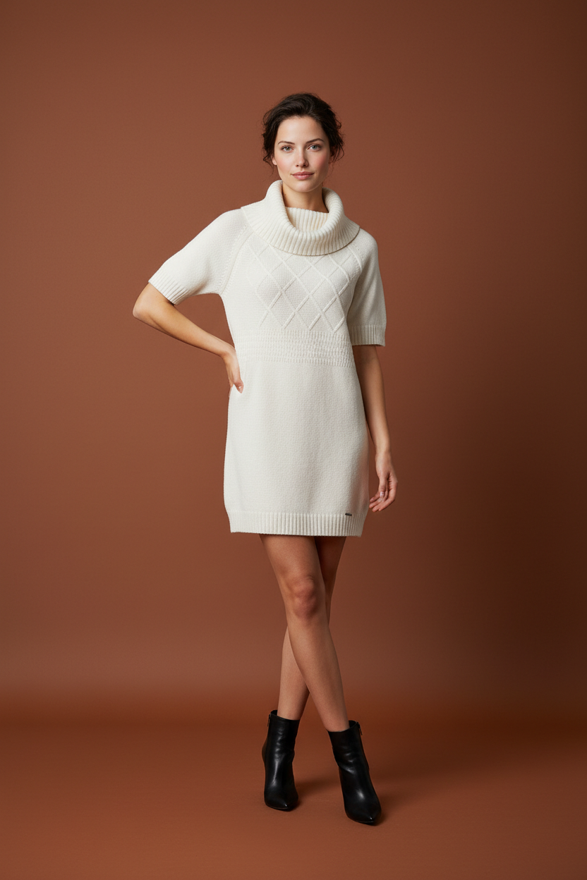 Vestido de malha branco de gola alta e botins pretos em fundo castanho