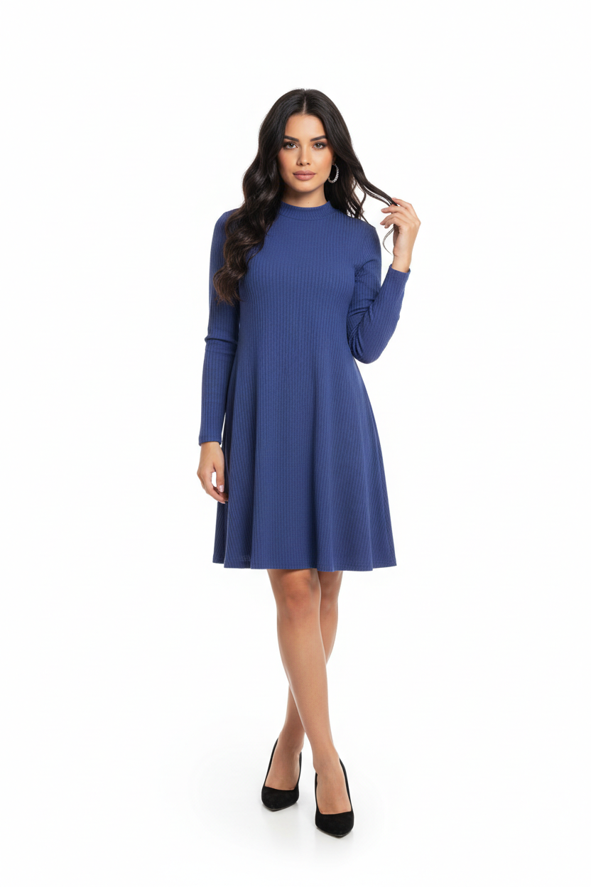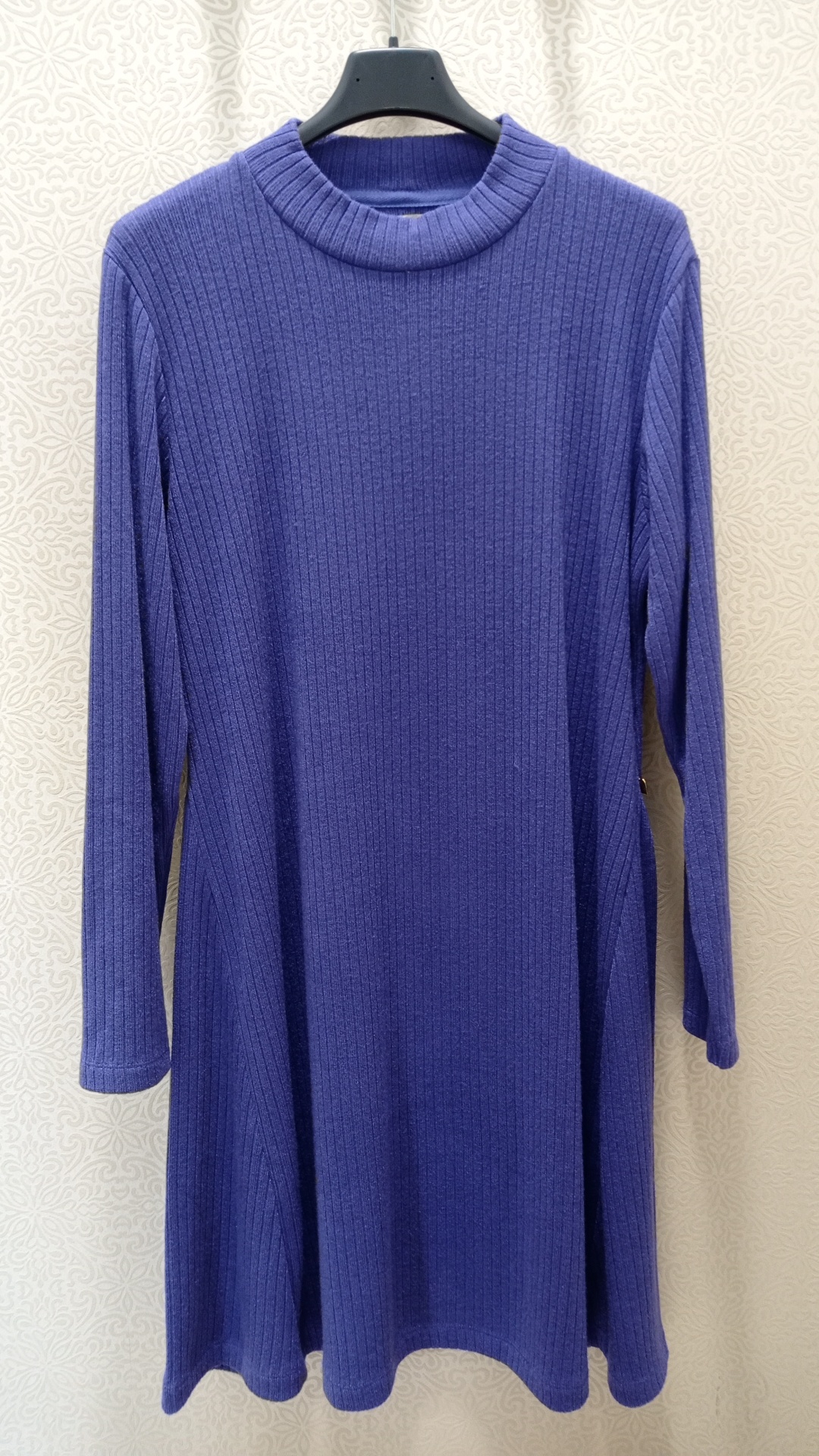 Vestido roxo em malha canelada. Meia gola e modelo em evasé.