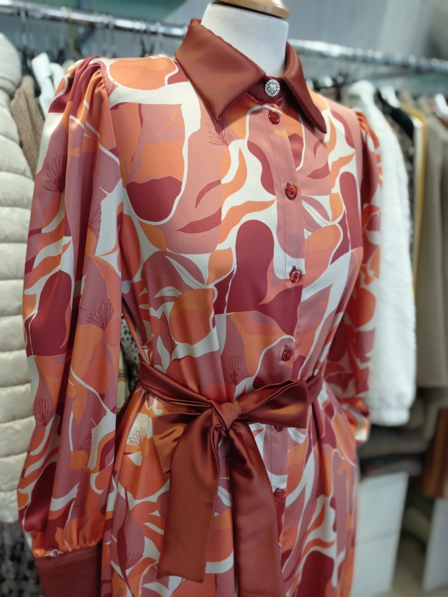 Com gola de blusa e botões até ao fundo.