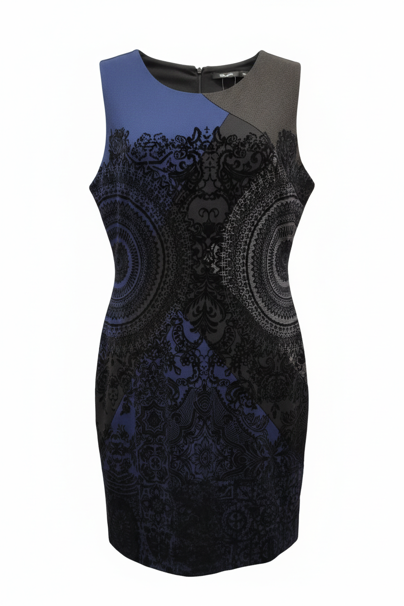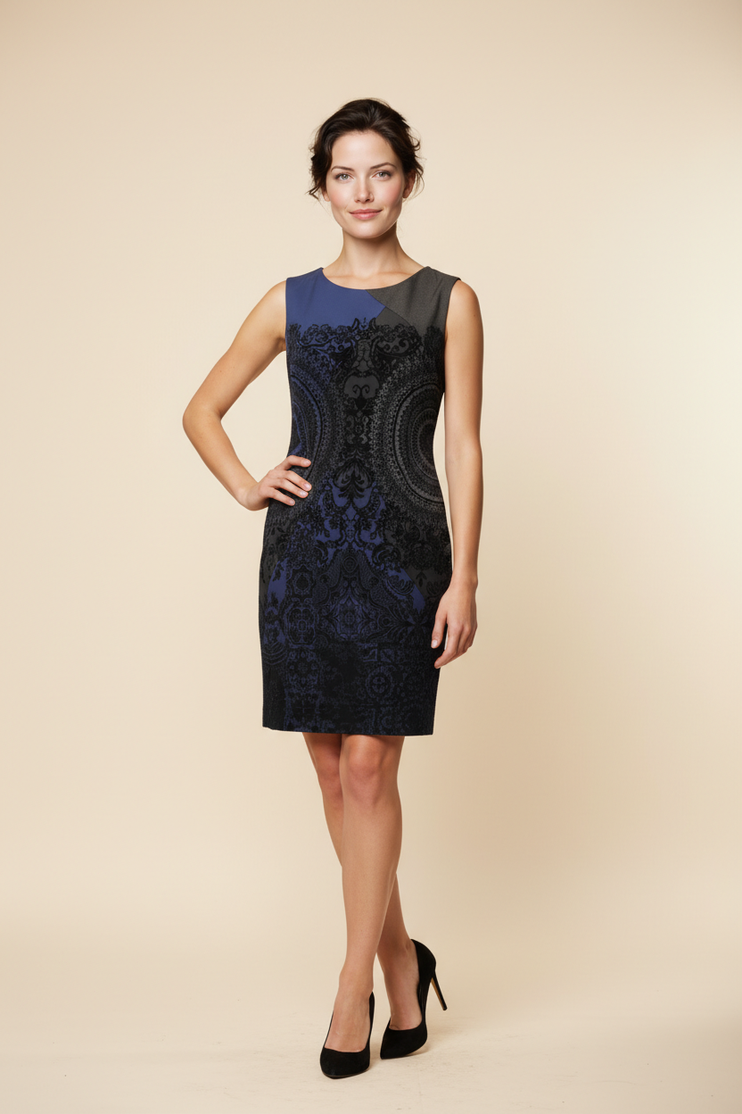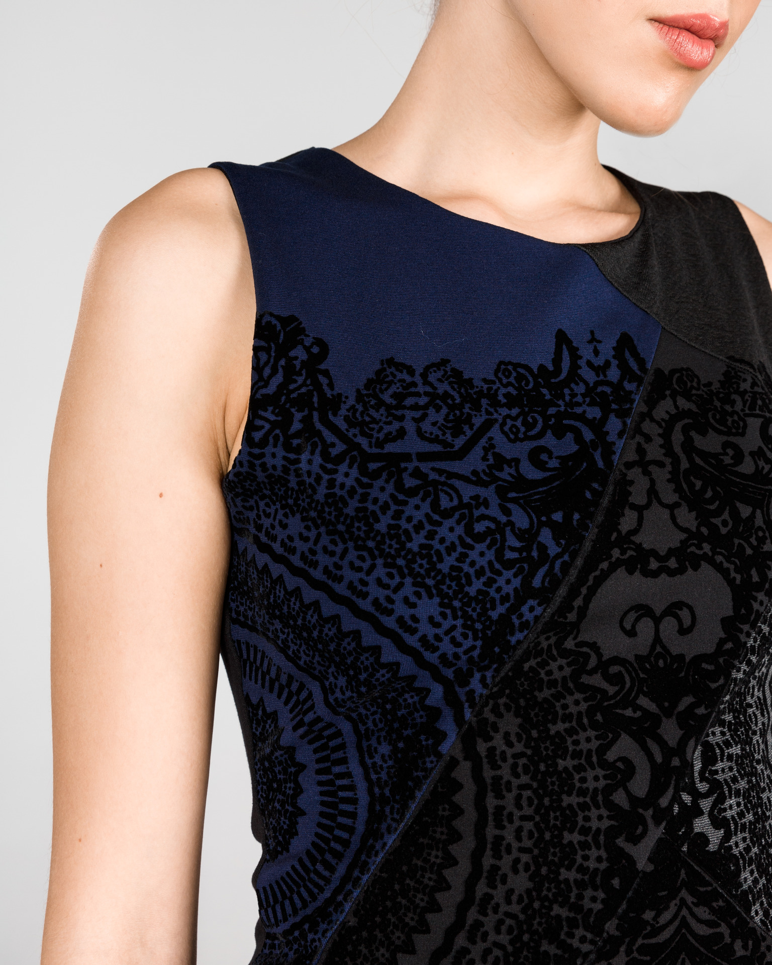 Vestido sem mangas em tecido grosso, com detalhes em veludo.