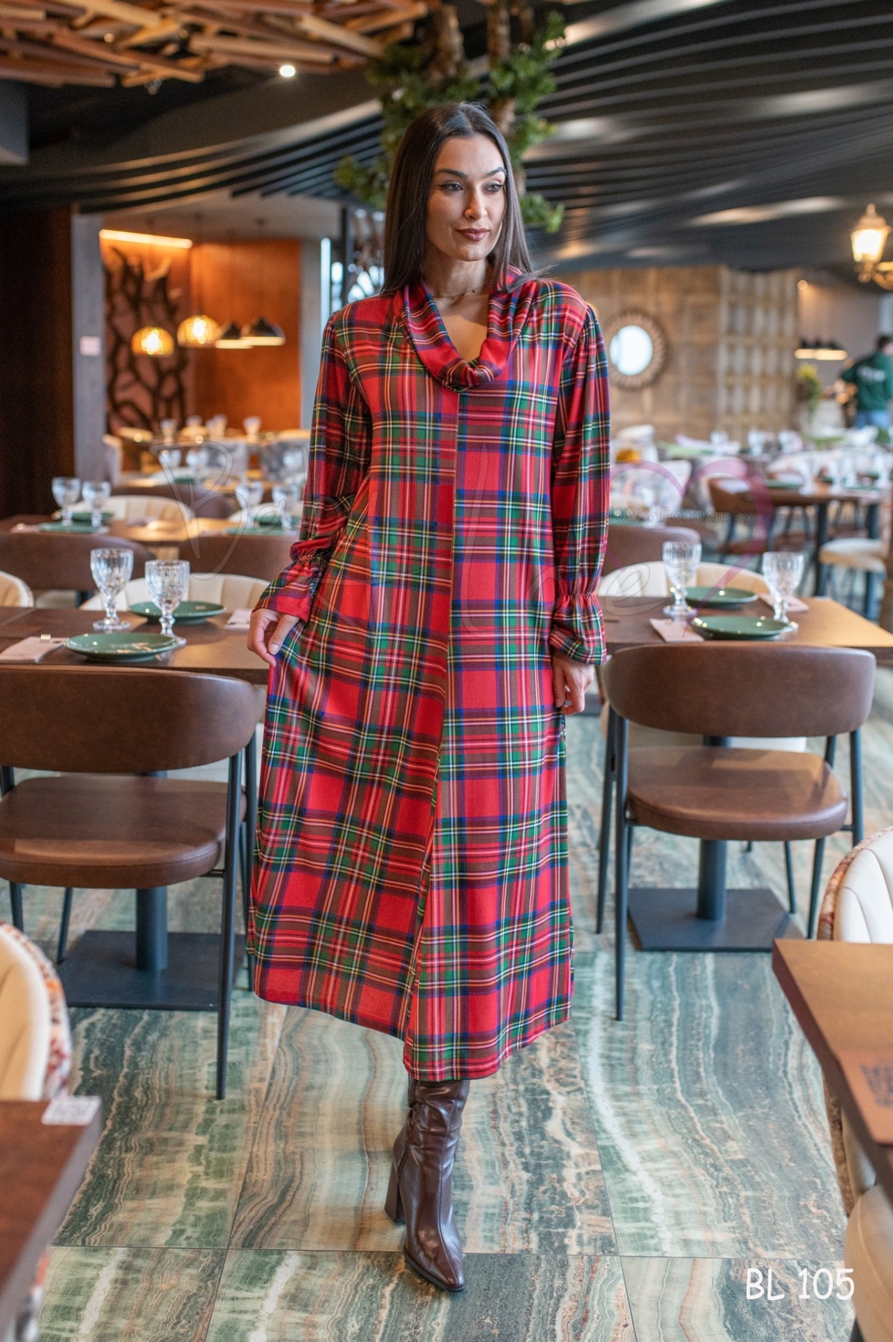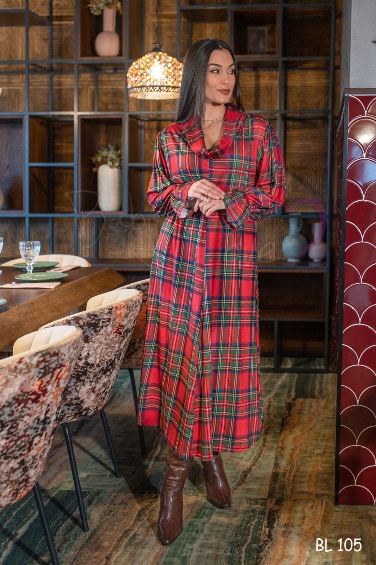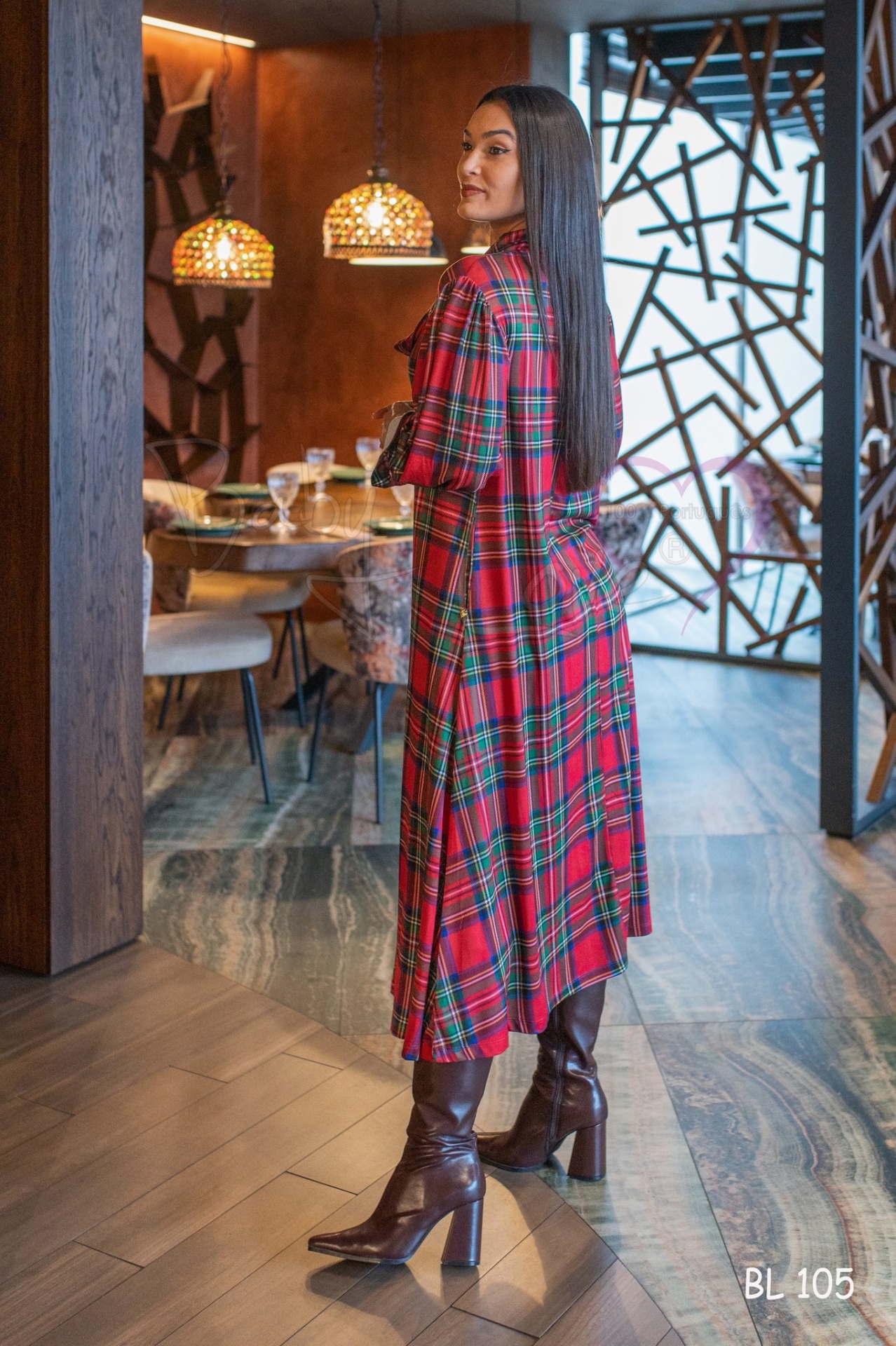 Vestido axadrezado em tons vermelho.